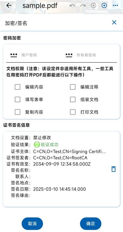 出于费用考虑,也可用自有证书对PDF进行签名,当然该PDF不能在其他平台或工具中验签,但可再v2doc中对PDF文档进行验证。